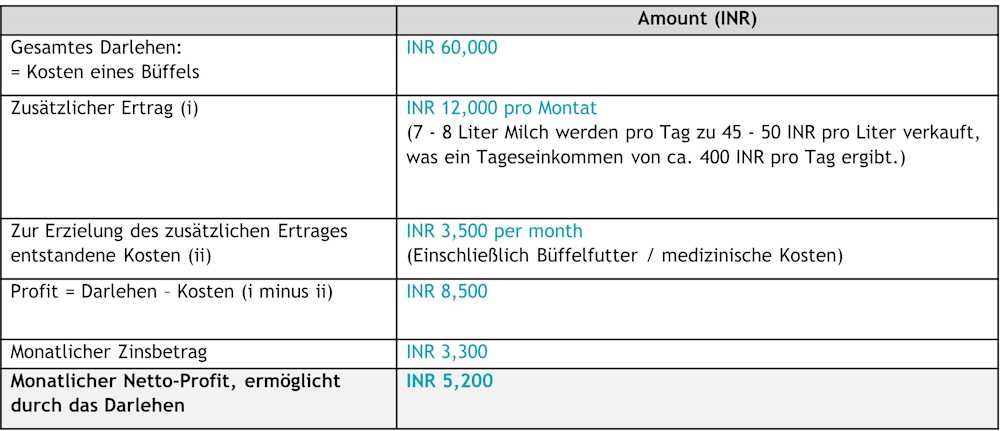 Die Frauen nutzten den Erlös des Kredits, um einen Büffel zu kaufen. Angesichts der hohen Vertriebsdichte der AMUL-Milchgenossenschaft im Bundesstaat können sie täglich etwa 7-8 Liter Büffelmilch an den nahe gelegenen AMUL-Molkereiladen verkaufen und so eine zusätzliche Einnahmequelle von 12.000 INR pro Monat generieren, was 145 USD entspricht. Der monatliche Kreditrückzahlungsbetrag beträgt 3.300 INR, was ein zusätzliches monatliches Haushaltseinkommen von 5.200 INR ergibt. Obwohl das durchschnittliche Haushaltseinkommen nicht bekannt ist, wird geschätzt, dass das Darlehen ein zusätzliches Einkommen von mindestens 20 % des gesamten monatlichen Haushaltseinkommens ermöglicht hat und sogar noch mehr, wenn das Darlehen vollständig zurückgezahlt ist.