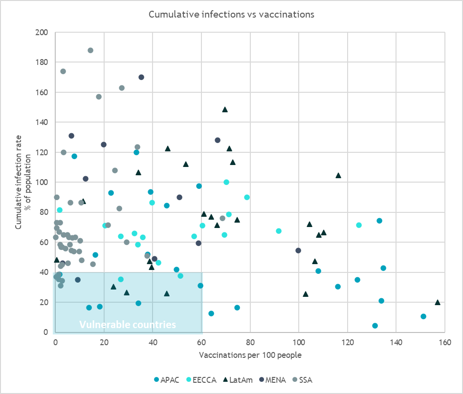 With regards to the most pressing question of this article, The Economist’s message is clear: in many EMDEs, large parts of populations were likely exposed to the virus in the past and have hence gained some (natural) immunity. Rather than point estimates, findings are presented in ranges, and those ranges widen as income levels decrease, meaning there is higher uncertainty about effective cumulative infections in poorer countries, probably due to more acute data limitations. Looking at mid-points of range estimates, the median of cumulative infections is at 64% of the population in EMDEs, compared to 14% in Advanced Economies (AE), see chart below. Differentiating EMDEs by income level does not provide much further insight, mid-points being at broadly similar, elevated levels. The regional picture though is interesting: Developing Asia is the region with the lowest cumulative infections (mid-point at 33%). Cumulative infections and hence natural immunity are quite high in Eastern Europe, the Caucasus and Central Asia (EECCA), the Middle East and Northern Africa (MENA) as well as Latin America (LatAm), where even the lower bound of range estimates points to roughly half of the populations having contracted Covid-19 in the past. For Sub-Saharan Africa (SSA), the mid-point suggests a relatively elevated level of natural immunity too (62%), but the range is extremely wide (0% - 120%). As the virus has spread around the globe, cumulative infections seem likely a function of institutional capacities and the possibility to follow social distancing and basic hygiene measures, which typically are not strongholds of poorer countries. As such, it is doubtful that SSA fared markedly better than other regions, and the assumption of rather elevated natural immunity should also hold there.