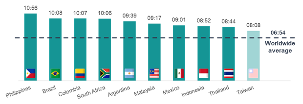 Time Spent on the Internet, Top Ten Countries (per day and across devices)